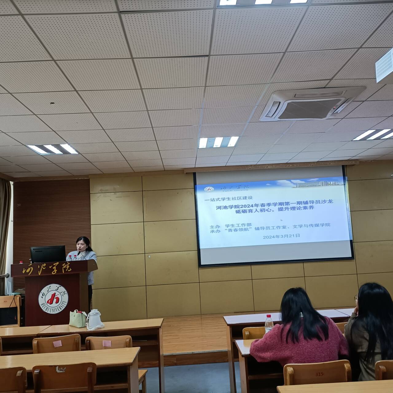 为进一步加强深化我校思想政治教育工作,提升辅导员理论教育素养水平为后续开展思想政治工作奠定思想理论坚实基础,更好地成为学生思想道路上的引路人,切实推动我校学生工作提质增效。3月21日我校学生工作处主办的“匠心铸魂 赋能成长”第一期辅导员沙龙活动在大学生活动中心315教室举行。本期沙龙活动的主题为砥砺育人初心,提升理论素养,“青春领航”辅导员工作室姚宁担任主讲嘉宾,我校全体专、兼职辅导员参加此次活动。