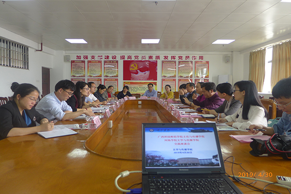 4月30日,广西科技师范学院文化与传播学院党总支书记、院长郑盛锦等一行13人到我院交流,我院院长欧阳珍、党委书记牙运豪、副院长陈代云、刘雨过,党委副书记韦柳以及部分教研室主任参加了交流活动。