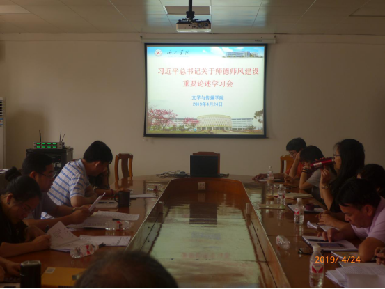 2019年4月24日下午,文传学院在格致楼823会议室召开了师德师风专题学习会。全体教职工参加了本次会议。会议由学院党委书记牙运豪主持。
