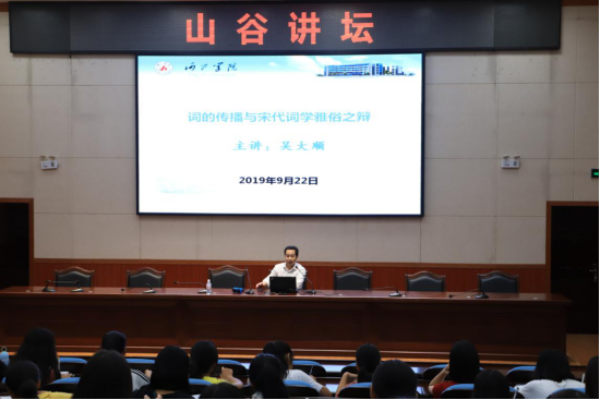 吴大顺教授在弘毅楼1区205报告厅作了“宋词传播与宋代词学雅俗之辩”专题讲座。他首先从宋人对柳永、苏轼词风的不同评价谈起,陈述了宋代不同时期的文人对柳苏二人的评价全然不同,而同一时期的评价却基本一致的文学现象。关于这一现象的原因,他从宋词的传播形态及其变迁角度进行了分析,他认为宋词的发展经历了三个阶段:一是以口头演唱为主要传播方式阶段,二是口头传播与文本传播并行发展阶段,三十以文本为主的传播阶段。最后,他谈到了宋词的传播方式与宋词文化功能的嬗变之间的关系,宋词的传播方式从歌曲传播演变成文本传播,其功能也开始发生变化,由原来单一娱宾遣兴的功能拓展成为表情言志的功能。在最后的互动环节中,吴大顺教授就同学们提出的“明清文人看哪些词谱”“诗的韵律是否与音乐性脱离”等问题做了详细解答。(文传学院记者团 刘璐 黄红萍/文 容丽莎 包春霞/图)