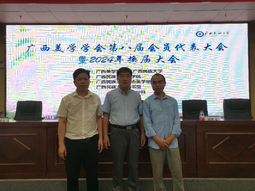 (上图右一为万志全教授,中间为广西美学学会会长李启军教授,左一为我校科技处副处长、广西美学学会常务理事欧造杰教授)