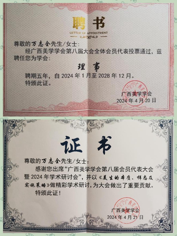 (上图为万志全教授的广西美学学会理事聘书与会议主题发言证书)