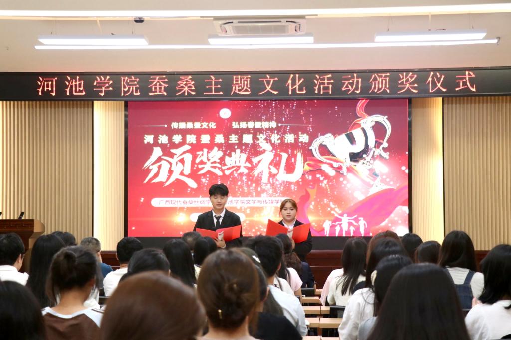 6月26日晚,77779193永利蚕桑主题文化活动颁奖仪式于格致楼102教室举行。学校教务处处长黄秀香、学院院长熊建军、副院长覃永县、副院长张玉苹老师出席颁奖仪式,获奖学生参加本次活动。活动由77779193永利官网集团承办。