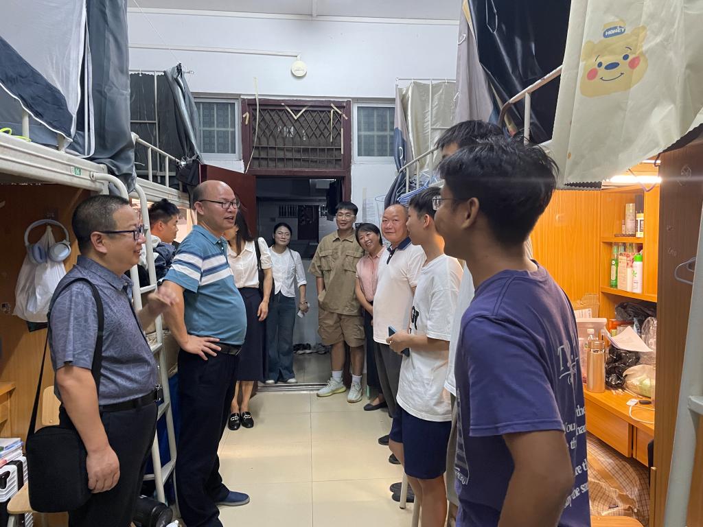 “家住哪里?”“来学校还适应吗?”“学习情况怎么样吗?”“考研吗?”每到一处学生宿舍,老师们都会与同学们亲切交谈。走访过程中,老师们与同学们围绕假期社会实践、返校行程安排、新学期学业规划等主题与同学们进行深入交流,全面了解了学生在暑假期间的各项情况,倾听学生需求。同时,鼓励同学们规划好大学生活,好好学习专业知识,鼓励高年级同学们考研。