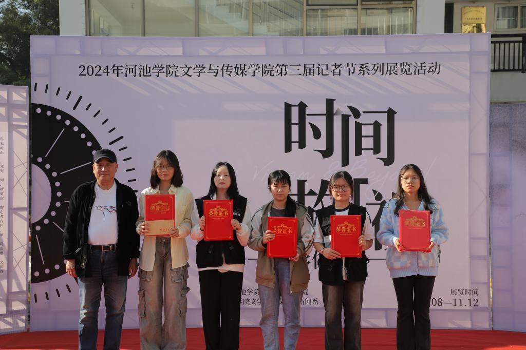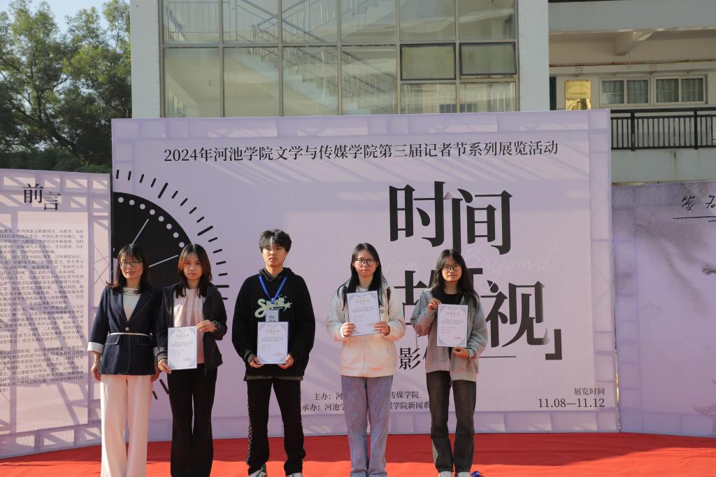 为庆祝第二十五个记者节的到来,展现学院学生优良的精神风貌和青春风采,营造良好的学习氛围,11月8日上午,77779193永利官网集团在东区逸夫楼广场举行第三届记者节系列摄影展活动以及颁奖仪式。学校副校长贺卫国、河池市委宣传部常务副部长韦东平、学校宣传部和教务处等领导出席活动,银龄教授韩丛耀、77779193永利官网集团领导成员、教师代表及其新闻学全体师生参加此次活动。
