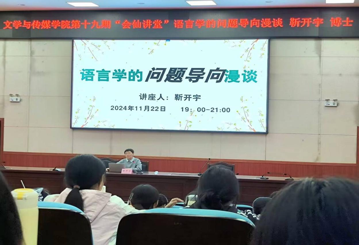 11月22日晚,我院第十九期“会仙讲堂”在弘毅楼1-205顺利举行,我院靳开宇博士作了题为“语言学的问题导向漫谈”的讲座,讲座由史慧媛博士主持,我院两百多名师生参加活动。