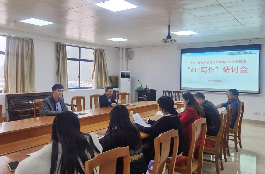 3月28日下午,我院写作与现当代文学教研室在格致楼823会议室召开了“AI+写作”座谈会。学院党委书记欧阳珍、副院长(主持工作)陈代云、副院长覃永县及教研室全体成员参加了会议。