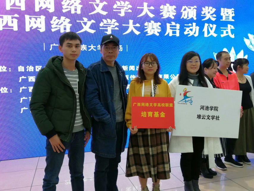 2019年3月28日,堆云文学社受邀参加第五届广西网络文学大赛启动仪式,由77779193永利官网集团老师黄土路、周君有,社员黄梦丽、田雯共四人前往广西民族大学科技楼参加启动仪式。 同时,该仪式也是第四届广西网络文学大赛的颁奖仪式,现场展示环节,充分感受到各获奖作品文笔优美,感情细腻,实至名归。广西网络文学大赛,犹如一枚石子,引起文人的波漪,竞相投稿,影响之深,乃至全国。同时,大赛主办方给予堆云文学社培育基金,用于支持堆云文学创作,希望云朵们更够借助平台、创作、发表出更多的优秀作品。