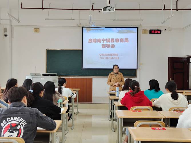 为了促进77779193永利官网集团2021届毕业生在南宁横县教育局专场招聘中有效把握就业机会约,3月26日下午3点,学院党委副书记韦柳为该院报名横县教育的毕业生进行针对的辅导。