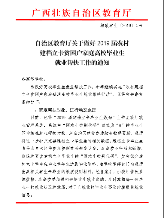 自治区教育厅关于做好2019届农村建档立卡贫困户家庭高校毕业生就业帮扶工作的通知