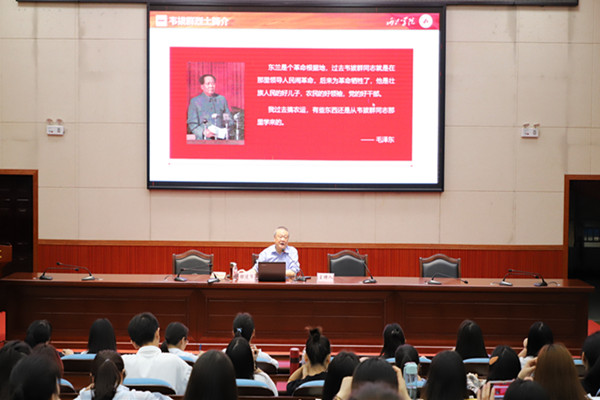 银建军本次讲座主要围绕韦拔群烈士简介、韦拔群精神的深刻内涵、韦拔群精神的当代意义三个方面进行了深入的讲解。银建军强调,韦拔群作为新中国成立做出突出贡献的英雄模范,他对党忠诚,一心为民,顾全大局,无私奉献的革命精神和敢为人先的创新精神非常值得今天的青年人去弘扬。他提出广大青年大学生应加强党史学习,紧密团结在以习近平同志为核心的党中央周围,敢为人先,坚持一切为了人民,发扬艰苦奋斗精神,担负起新时代新青年的责任与使命。