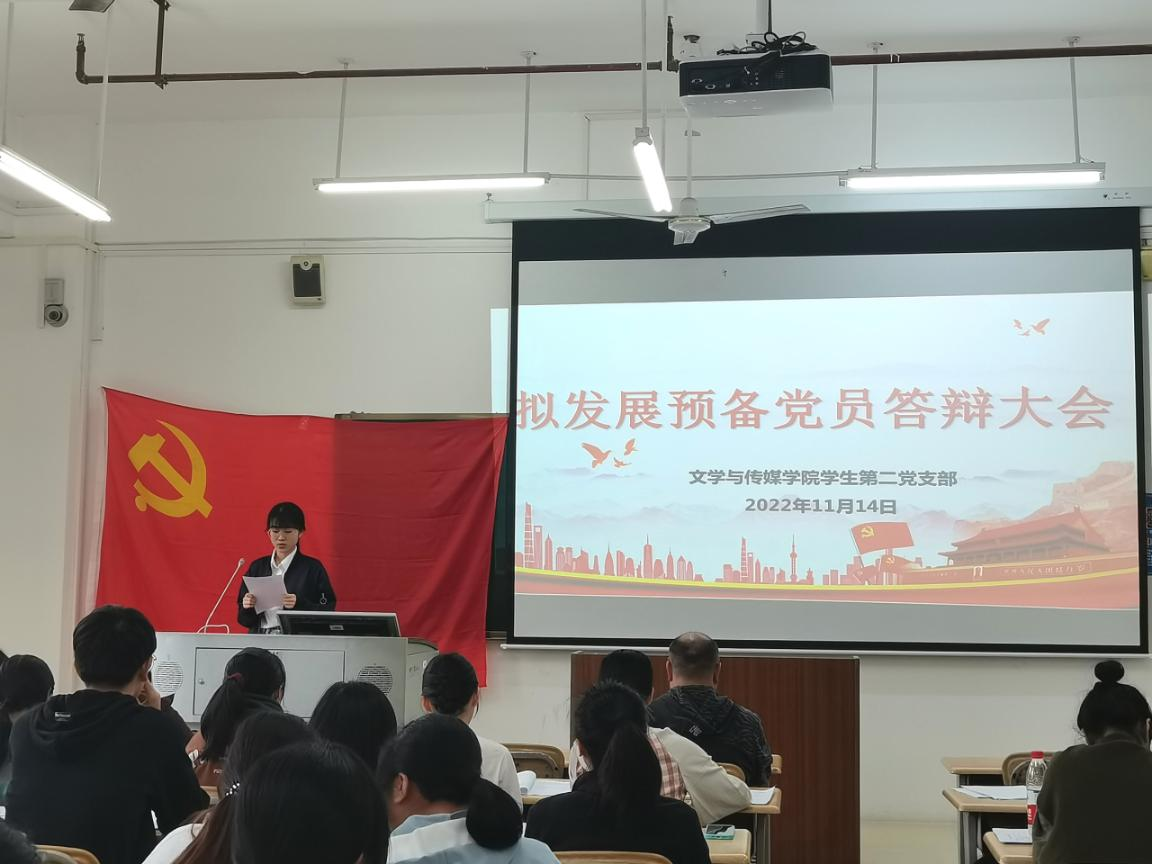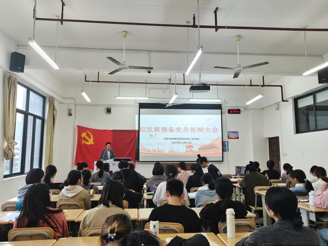 2022年11月14日上午,文传学院学生第二党支部在格致楼309教室召开了2022年下半年拟发展预备党员答辩会。本次会议由文传学院学生第二党支部书记韦金朋主持,学院党委副书记纪委书记韦振宇和教师党员银晓明及全体在校生党员参加。