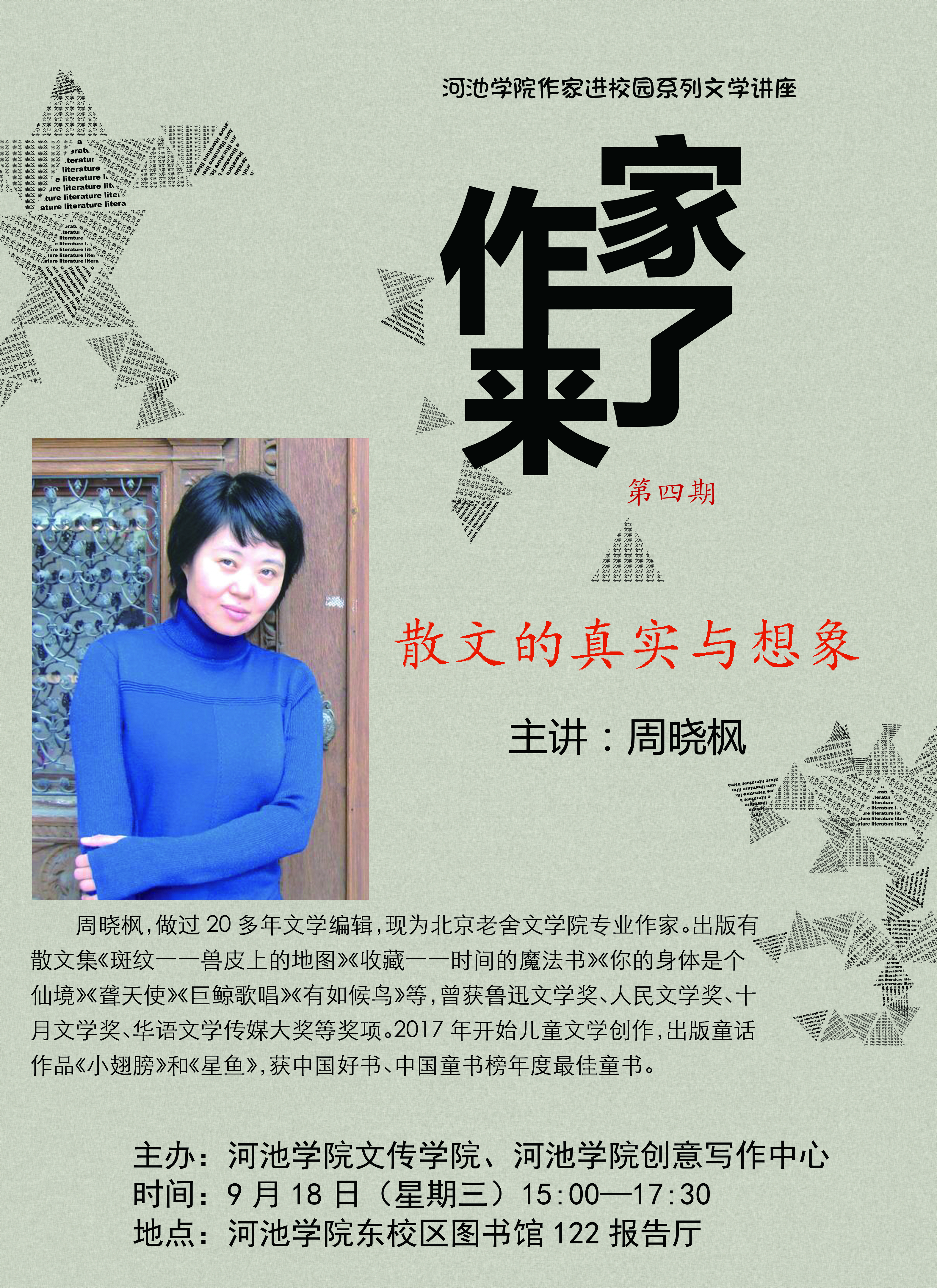 周晓枫,1969年6月生于北京,做过20多年文学编辑,现为北京老舍文学院专业作家。出版有散文集《斑纹一一兽皮上的地图》《收藏一一时间的魔法书》《你的身体是个仙境》《聋天使》《巨鲸歌唱》《有如候鸟》等,曾获鲁迅文学奖、人民文学奖、十月文学奖、华语文学传媒大奖等奖项。2017年开始儿童文学创作,出版童话作品《小翅膀》和《星鱼》,获中国好书、中国童书榜年度最佳童书。