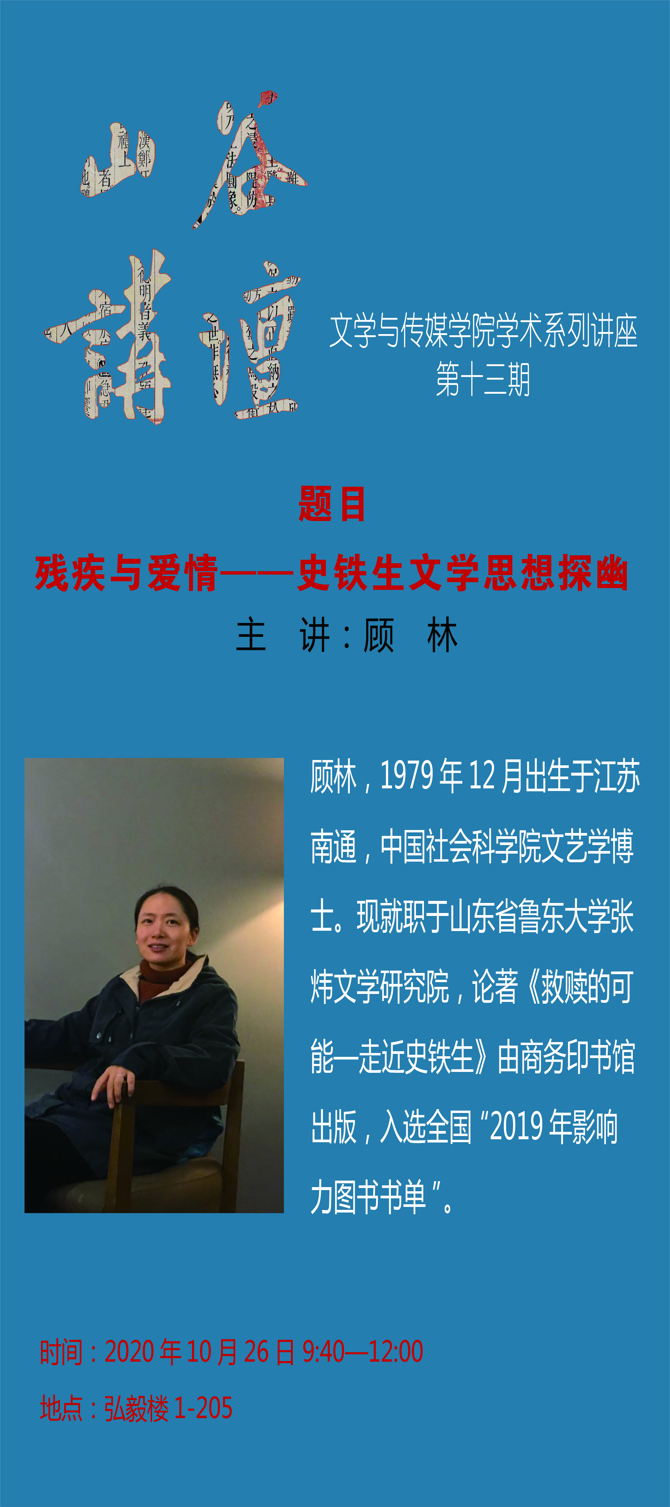 顾林,1979年12月出生于江苏南通,中国社会科学院文艺学博士。现就职于山东省鲁东大学张炜文学研究院,论著《救赎的可能—走近史铁生》由商务印书馆出版,入选全国“2019年影响力图书书单”。