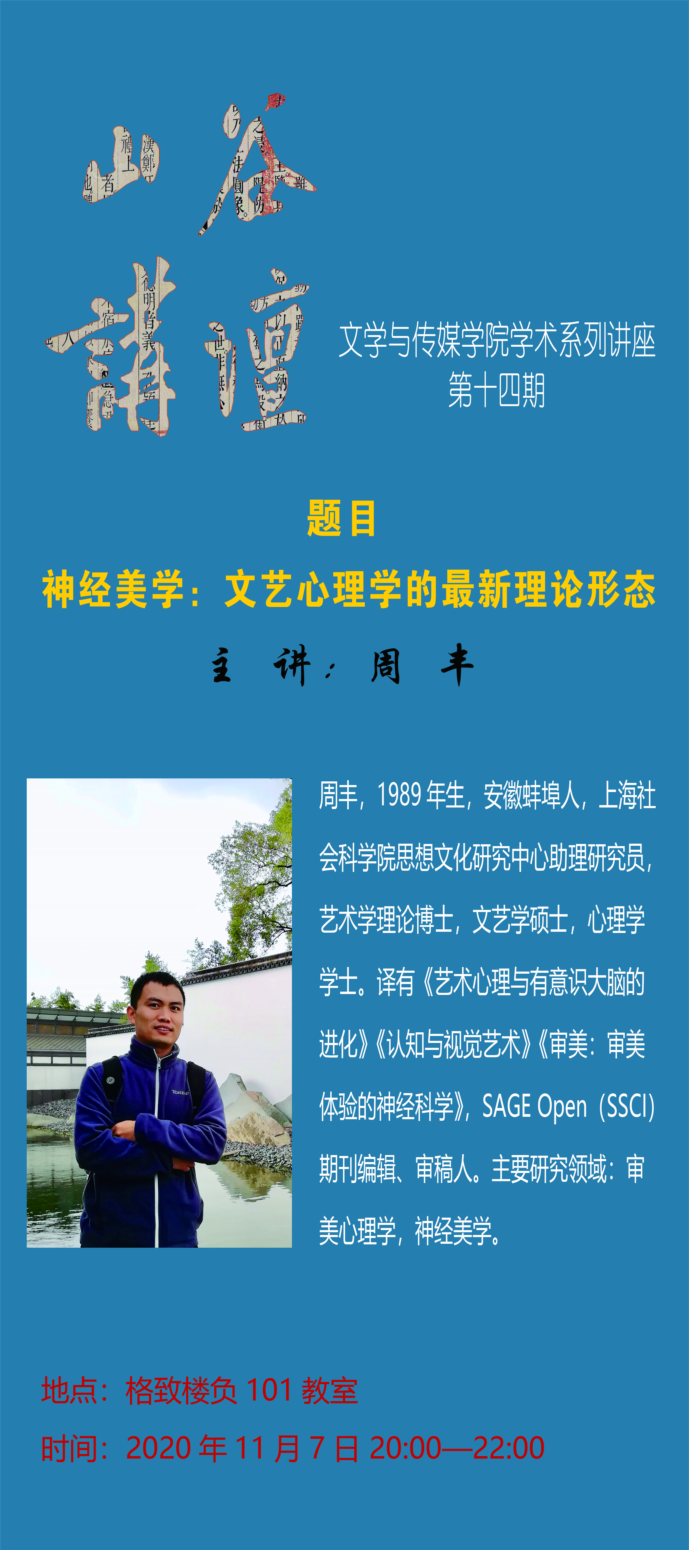 周丰,1989年生,安徽蚌埠人,上海社会科学院思想文化研究中心助理研究员,艺术学理论博士,文艺学硕士,心理学学士。译有《艺术心理与有意识大脑的进化》《认知与视觉艺术》《审美:审美体验的神经科学》,SAGE Open(SSCI)期刊编辑、审稿人。主要研究领域:审美心理学,神经美学。