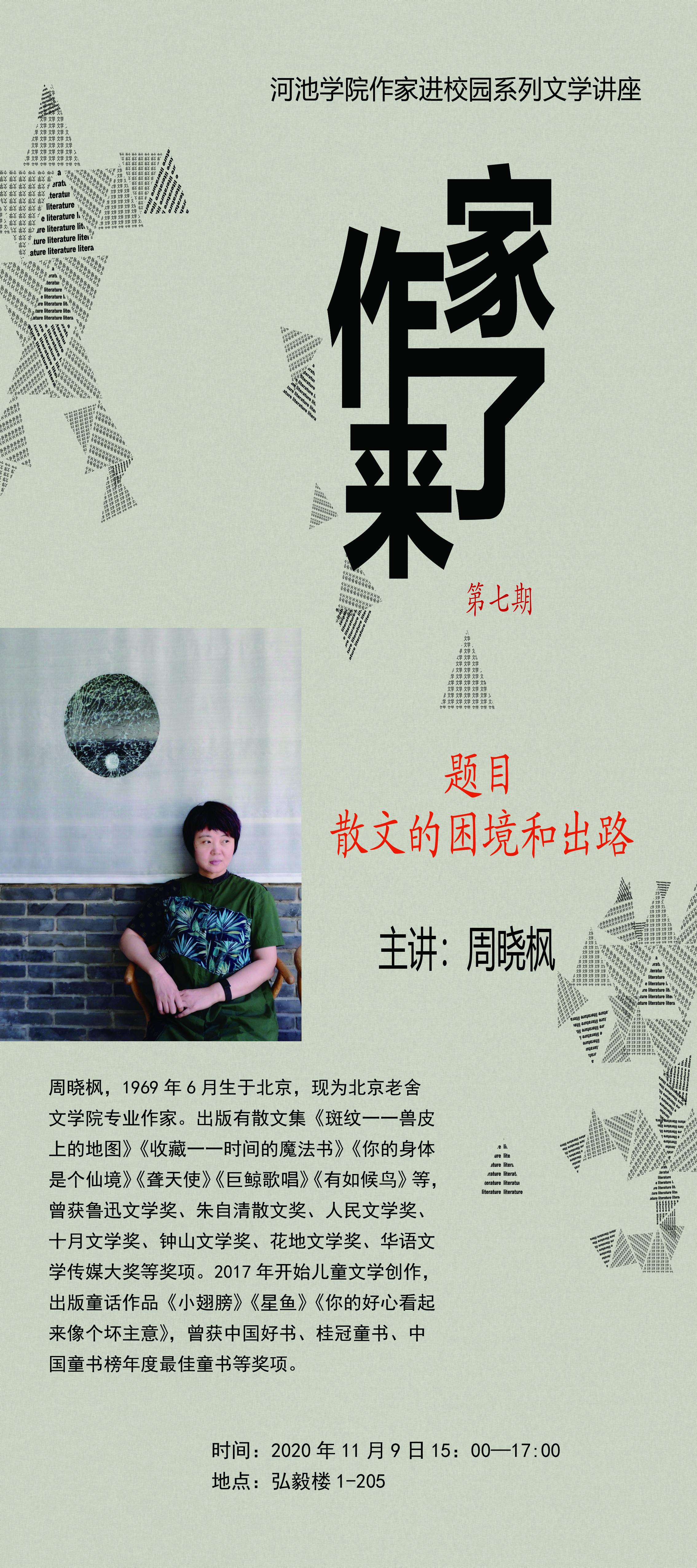 周晓枫,1969年6月生于北京,现为北京老舍文学院专业作家。出版有散文集《斑纹一一兽皮上的地图》《收藏一一时间的魔法书》《你的身体是个仙境》《聋天使》《巨鲸歌唱》《有如候鸟》等,曾获鲁迅文学奖、朱自清散文奖、人民文学奖、十月文学奖、钟山文学奖、花地文学奖、华语文学传媒大奖等奖项。2017年开始儿童文学创作,出版童话作品《小翅膀》《星鱼》《你的好心看起来像个坏主意》,曾获中国好书、桂冠童书、中国童书榜年度最佳童书等奖项。