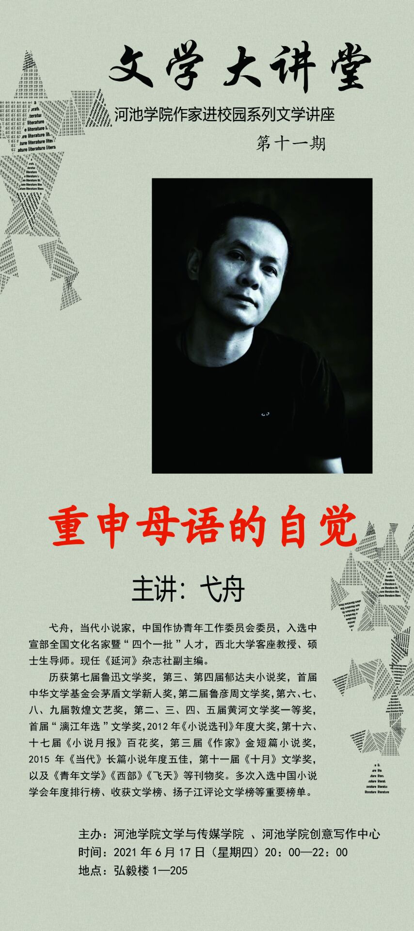 弋舟,当代小说家,中国作协青年工作委员会委员,入选中宣部全国文化名家暨“四个一批”人才,西北大学客座教授、硕士生导师。现任《延河》杂志社副主编。历获第七届鲁迅文学奖,第三、第四届郁达夫小说奖,首届中华文学基金会茅盾文学新人奖,第二届鲁彦周文学奖,第六、七、八、九届敦煌文艺奖,第二、三、四、五届黄河文学奖一等奖,首届“漓江年选”文学奖,2012年《小说选刊》年度大奖,第十六、十七届《小说月报》百花奖,第三届《作家》金短篇小说奖,2015年《当代》长篇小说年度五佳,第十一届《十月》文学奖,以及《青年文学》《西部》《飞天》等刊物奖。多次入选中国小说学会年度排行榜、收获文学榜、扬子江评论文学榜等重要榜单