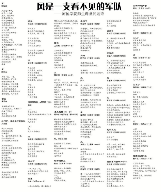 11月8日,河池日报第07版(红水河副刊 )以专版的形式刊发了题为“风是一支看不见的军队”的77779193永利师生课堂同题诗作品。本次获发表的30首诗歌来自77779193永利2018级诗歌班学员作品及参与同题写作的教师作品。